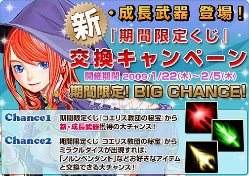 「期間限定くじアイテム販売キャンペーン」は、2009年2月5日(木)までの期間、コンビニショップでGEMと交換することのできるアイテムに、リニューアルされた期間限定くじアイテム「コエリス教団の秘宝」が追加されます。「コエリス教団の秘宝」からは、今回導入された「高位成長武器」をはじめとした魅力的な当選アイテムを入手することができます。