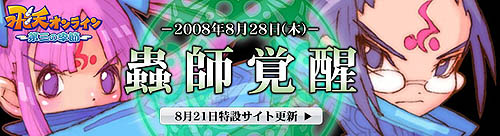 株式会社ガマニアデジタルエンターテインメント(本社:東京都品川区、代表取締役兼CEO :劉 柏園、http://www.gamania.co.jp/ 以下「ガマニア」)の運営するオンラインゲームサービス「飛天オンライン」では、8 月28 日の実装に先駆けて公開している、新職業「蟲師」特設サイトの情報更新と、カウントダウンキャンペーンの実施をお知らせいたします。